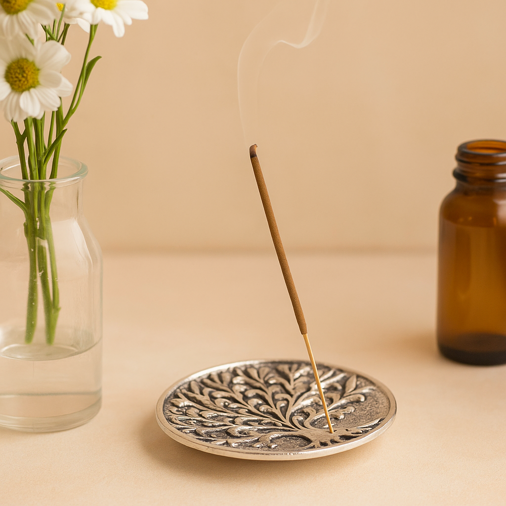 Il freddo splendore dell'alluminio color argento incontra il caldo silenzio dell'incenso—stabile, semplice e radicante. Realizzato in India, dove l'incenso accompagna da tempo i rituali quotidiani domestici e templari, offre una base calma e pratica ai tuoi momenti di pausa. Il motivo dell'Albero della Vita parla di crescita, connessione e radicamento, un simbolo gentile benvenuto in case e studi. 🌿