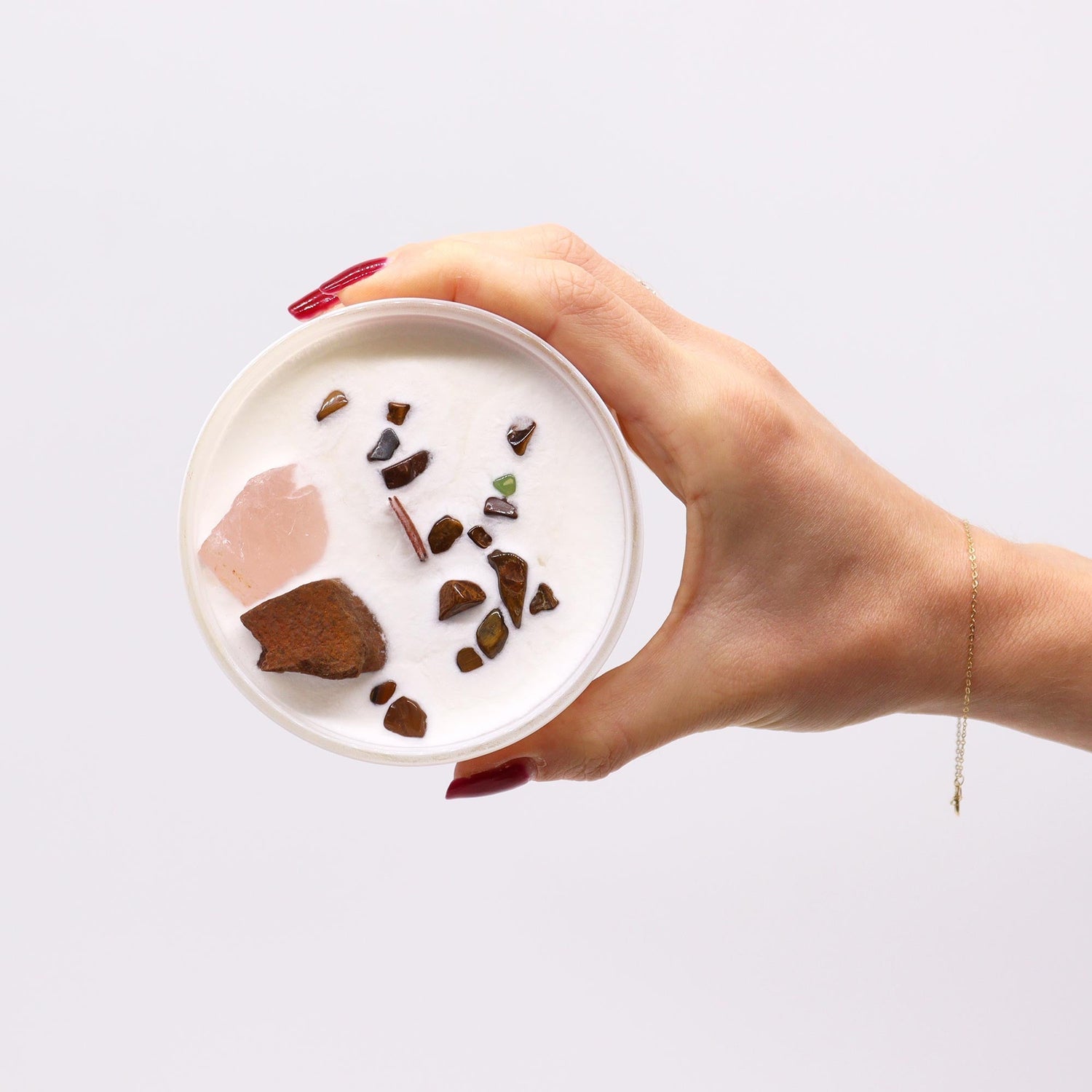Cristalli: Pezzi levigati di occhio di tigre (dorato-marrone, lucentezza setosa) e quarzo rosa (rosa tenue) sono incastonati in cima; potresti anche notare piccoli frammenti verdi e tonalità profonde, che aggiungono variazioni naturali da candela a candela.