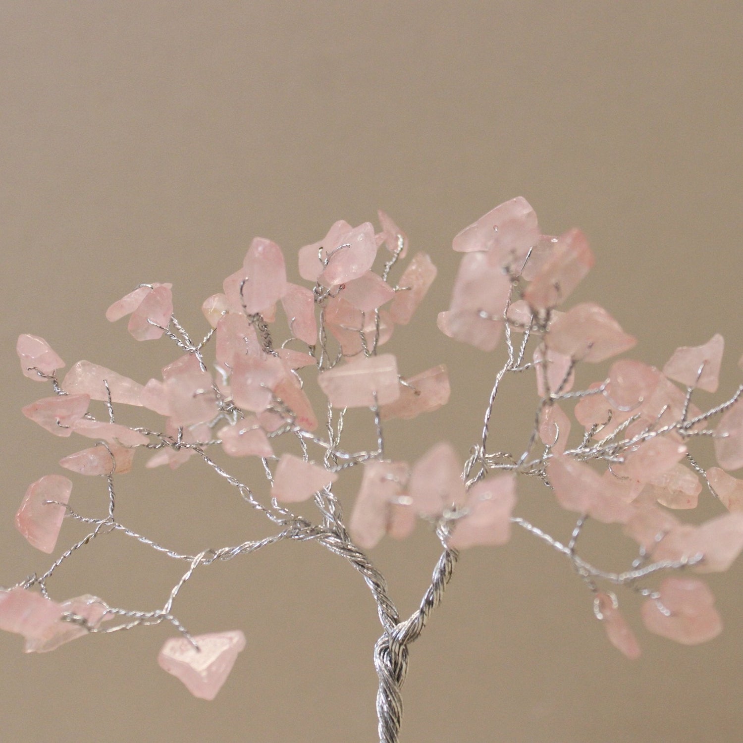 Ogni albero è intrecciato a mano in India, con circa 80 frammenti di quarzo rosa che formano il fogliame. Le pietre sono delicatamente traslucide, mostrando tonalità rosate e variazioni naturali. Il tronco di filo si estende nella base, con radici che si diramano sulla superficie per un aspetto radicato. La base è una piramide trasparente con inclusioni color rosa e un dettaglio a spirale di rame.