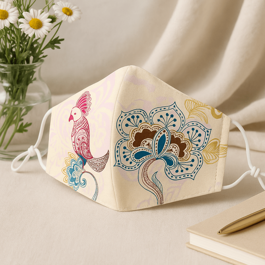 Tessuto morbido e tessuto, una finitura liscia e un mandala calmo in blu e beige su uno sfondo chiaro—questa maschera riutilizzabile si indossa come un accessorio studiato per lo stile di tutti i giorni. Accenti delicati di rosa e verde aggiungono un tocco discreto. 🎨