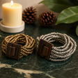Nella pratica buddista e induista, i mala sono usati per contare mantra, respiri o intenzioni. Un bracciale mala offre lo stesso scopo in una forma compatta, facile da tenere vicino durante tutta la giornata. La chiusura in legno aggiunge una nota naturale e radicata spesso apprezzata nei mala, mentre le perle metalliche—disponibili in tonalità calda ottone/oro o fredda argento—richiamano la calma lucentezza del metallo rituale e suggeriscono qualità come stabilità e chiarezza. File strettamente infilate creano un ritmo uniforme senza ciondoli o distrazioni. ✨