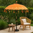 La tenda arancione brillante si apre come un piccolo sole, la sua superficie di cotone rifinita a mano da artigiani di Bali. Motivi tono oro tracciano il bordo, mentre nappine e piccoli ciondoli metallici oscillano leggermente, portando un movimento delicato e un carattere caldo e festoso al tuo spazio—interno come decorazione o esterno come espressione di bellezza. ☀️