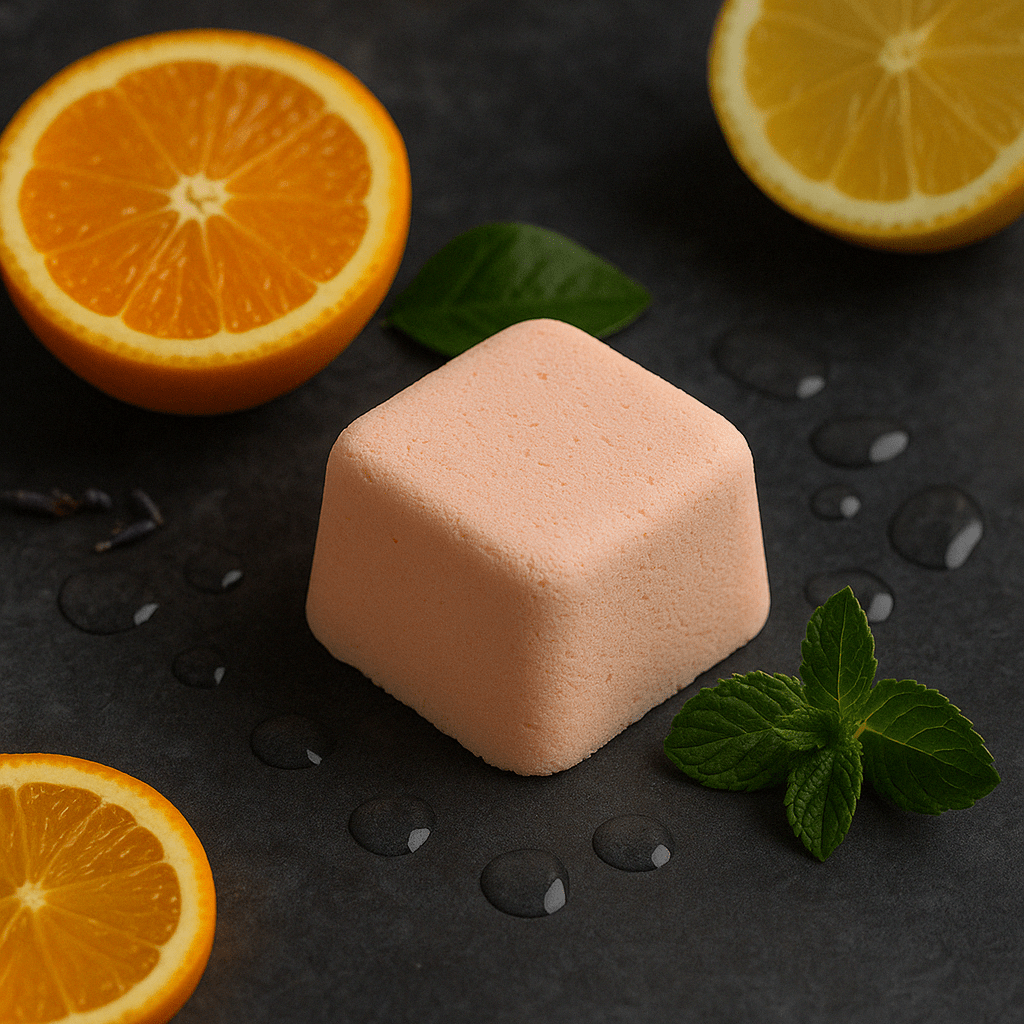 Un piccolo cubo opaco color pesca pastello riposa nel palmo della tua mano—bordi ammorbiditi, una piccola fossetta silenziosa al centro. Posizionalo ai tuoi piedi e la doccia diventa un rituale di aromaterapia, un'esplosione fragrante di oli essenziali trasportata dal vapore caldo. 🍊