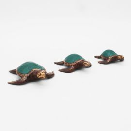 Elke zeeschildpad is gevormd in een zwemhouding, met uitgestrekte vinnen en het hoofd lichtjes geheven, alsof hij een zachte stroming opvangt. De bolle schelp glanst in een rijke groene kleur met een glanzende afwerking, afgezet met goudkleurige accenten en een fijne, kralenachtige rand. Daarentegen hebben het lichaam, het hoofd en de vinnen een warmere roodbruine tint met een gebeeldhouwde textuur en een subtielere glans. Samen vormen de set van drie een kleine stoet die je langs een schoorsteenmantel kunt rangschikken, tussen boeken kunt nestelen, of over een vensterbank of nachtkastje kunt laten drijven.