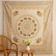 Crèmekleurige stof brengt een zachte warmte in de kamer. Uitgespreid over het bed geeft het een zachte textuur; aan de muur trekt het vierkante, symmetrische mandala de blik met een stille aanwezigheid.