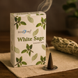 Wanneer de kegel vlam vat en de punt gloeit, stijgen bleke rooklinten op die een schone, kruidige helderheid in de kamer brengen. De geur is droog-groen en zacht houtachtig, en zet een zachte, ongedwongen sfeer. Witte salie (Salvia apiana) heeft betekenis voor veel inheemse gemeenschappen in Noord-Amerika, waar het met eerbied in ceremonies wordt gebruikt; wij eren deze wortels en nodigen uit tot mindful en respectvol gebruik thuis. 🌿
