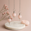 Rustig en stabiel, biedt deze pendel een eenvoudige manier om te pauzeren, te focussen en naar binnen te luisteren. Een gefacetteerd blush-roze rozenkwarts lichaam hangt aan een zilverkleurige ketting, eindigend in een taps toelopende metalen punt; de gladde, gepolijste oppervlakken vangen het licht zonder afleiding. 🌸
