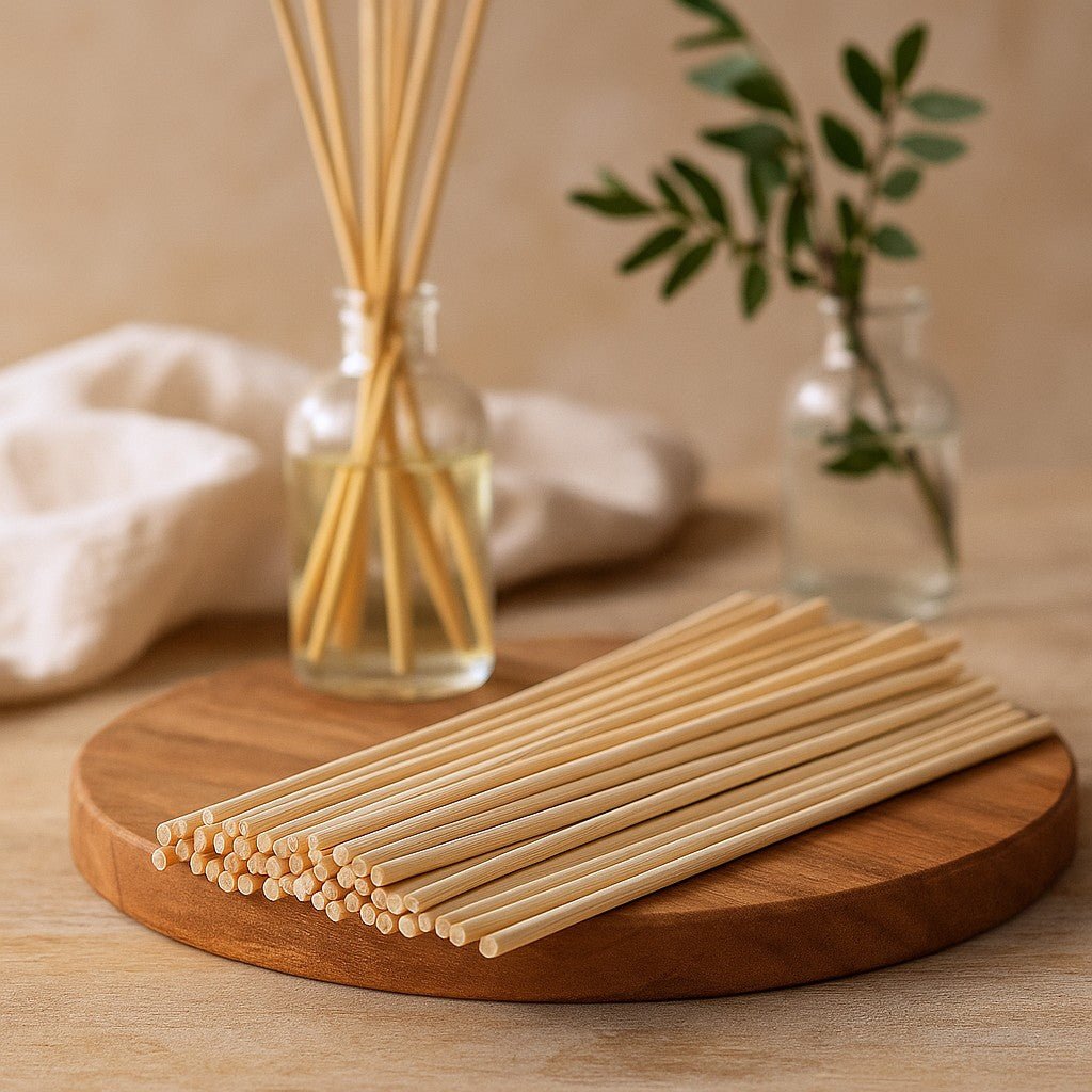 Gemaakt van natuurlijk rotan, gekozen vanwege de open, poreuze kanalen die olie efficiënt opnemen en gelijkmatig verspreiden. De stokjes zijn glad en recht met een lichte, natuurlijke houttint; schoon gesneden uiteinden en een uniforme diameter van 3 mm helpen de capillaire werking consistent te houden over hun lengte van 25 cm. Wanneer oudere rietstokjes verzadigd of stoffig worden, verzacht het aroma — het opfrissen ervan herstelt helderheid en frisheid. 💧