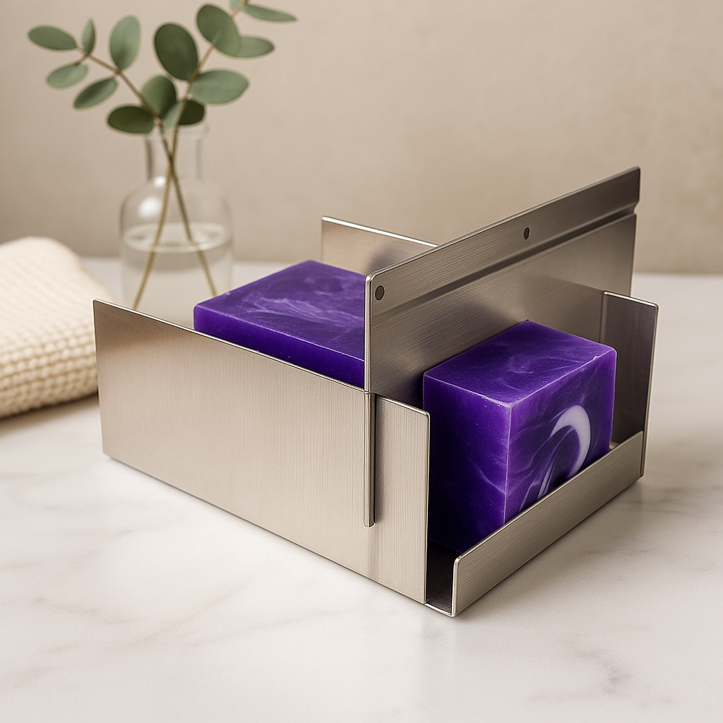 Recht-hoekige panelen houden alles uitgelijnd, met een open, doosachtig ontwerp dat gemakkelijk te zien en eenvoudig af te nemen is. De utilitaire bouw past zowel bij marktkramen, studio's als winkelbalies — een stil, betrouwbaar hulpmiddel voor makers die waarde hechten aan een nette presentatie en onhaast vakmanschap. Een doordacht cadeau voor zeepmakers die genieten van een goed gemaakt gereedschap. 🛠️