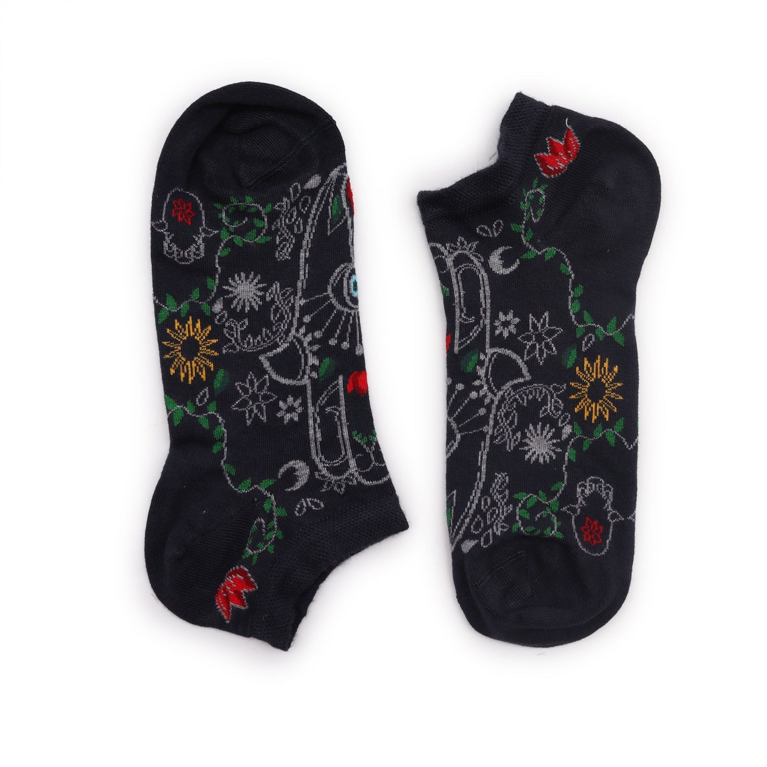 Kleine troost die je door de dag draagt — deze laag uitgesneden sokken brengen een zachte aanraking, een rustige pasvorm en een stille vleug patroon op een diepe, donkere basis. Het bloem- en rankmotief omlijst de Hamsa-hand en voegt een zachte betekenis toe aan een alledaags essentieel item. 🧦