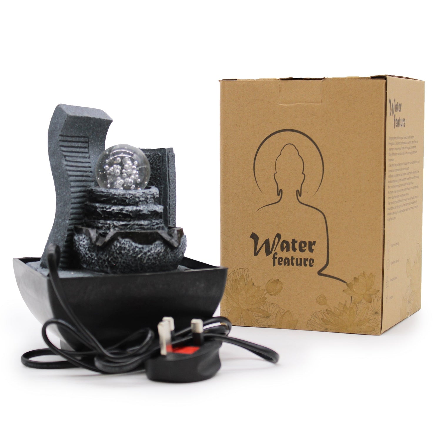 Rustig en compact met 18 cm wordt deze tafelwaterfontein een vredig middelpunt voor je bureau of plank. Donker houtskool, steenachtige treden rijzen uit een gladde kom, met een heldere bol dooraderd met kleine bubbels—matte textuur ontmoet glas voor een kalme, geaarde uitstraling. 💧