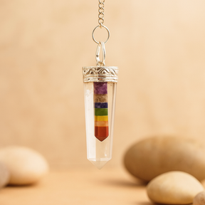 Vormgegeven als een langwerpig prisma dat toeloopt naar een gebalanceerde punt, voelt de hanger glad en kalmerend aan. Een zilverkleurige metalen kap met subtiele geometrische textuur voegt een zachte glans toe, klaar voor je ketting. Binnen het heldere lichaam symboliseert de zevenkleurige inleg het chakra-spectrum — een eenvoudige, levendige herinnering aan harmonie die de dag door gedragen wordt. ✨