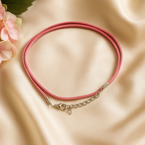 Zacht en mat met een zachte, fluweelachtige uitstraling, ligt dit blush-roze koord soepel tegen de huid. De eenvoudige lus zit netjes als een choker of net daaronder, en brengt een subtiele kleurtoevoeging aan de dagelijkse outfit.