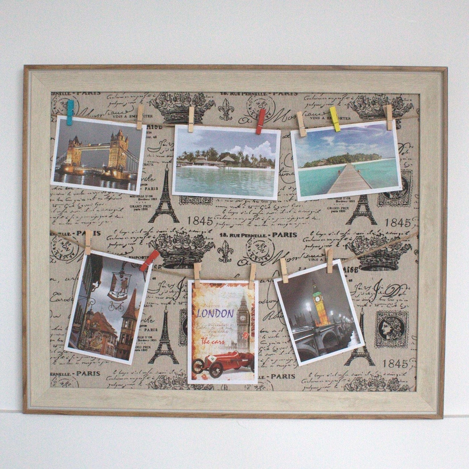 Een licht houten frame met zichtbare nerf omringt een beige, linnenachtig achtergrond bedrukt in zwart met vintage ansichtkaartmotieven—Eiffeltoren silhouetten, kronen, poststempels en vloeiende letters. De Eiffeltoren wordt algemeen erkend als een symbool van de creatieve geest van Parijs en de vreugde van reizen; thuis wordt het vaak bewaard als een zachte herinnering aan reizen en correspondentie. Horizontale touwtjes spannen zich over het frame, met kleine houten clips in natuurlijke en zachte kleuren klaar om foto's, notities en kunst vast te houden. Het neutrale palet past gemakkelijk in moderne, klassieke of eclectische interieurs, en het open peg-on-string ontwerp maakt het verfrissen van je display eenvoudig en aangenaam. 🗼✉️