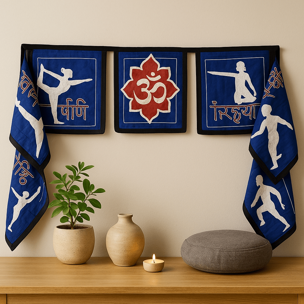 Geworteld in de Himalaya-regio's worden gebedsvlaggen traditioneel in vijf kleuren gehangen, elk ter ere van een natuurlijk element — blauw (lucht/ruimte), wit (lucht), rood (vuur), groen (water) en geel (aarde). Terwijl de wind waait, wordt geloofd dat de geprinte gebeden en symbolen mededogen, vrede en bescherming voor alle wezens verspreiden. Deze vlag weerspiegelt die geest door betekenisvolle motieven: een centrale lotusbloemvorm met het heilige "ॐ" (Om) en zijpanelen met sierlijke yogahoudingen en accenten in Devanagari-schrift. Het Om-symbool wordt breed gekoesterd in Indiase en Himalaya-tradities als teken van eenheid en het oergeluid; de lotus staat vaak voor zuiverheid en veerkrachtige groei. 🕉️