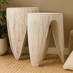 Met de hand gesneden en stilistisch sculpturaal, brengt deze houten kruk eenvoud, stabiliteit en tijdloos design in de kamer. Het bleke whitewash-oppervlak en de zacht afgeronde randen geven een gegronde aanwezigheid en natuurlijke warmte die zich zachtjes in elke ruimte nestelt.