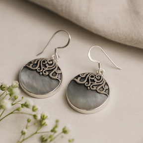 Zachte iriserende glans ontmoet gepolijst metaal: cirkelvormige druppeloorbellen met een parelachtige schijf die zilver, grijs en zachte regenboogtinten reflecteert terwijl ze zwaaien. Een delicate opengewerkte overlay kroont elke schijf, wat lichtheid en een stille glans toevoegt bij elke stap. 🐚