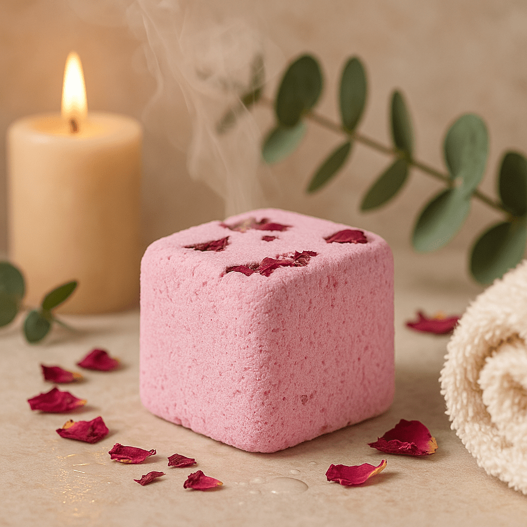 En liten, solid kube som forvandler vanlig damp og vann til et aromaterapiritual — et duftende utbrudd av essensielle oljer for øyeblikkene du går inn og puster ut. Lys rosa med en myk, matt tekstur og spredte dyp-roseblader, ser den rolig og stille innbydende ut på dusjgulvet. 🫧