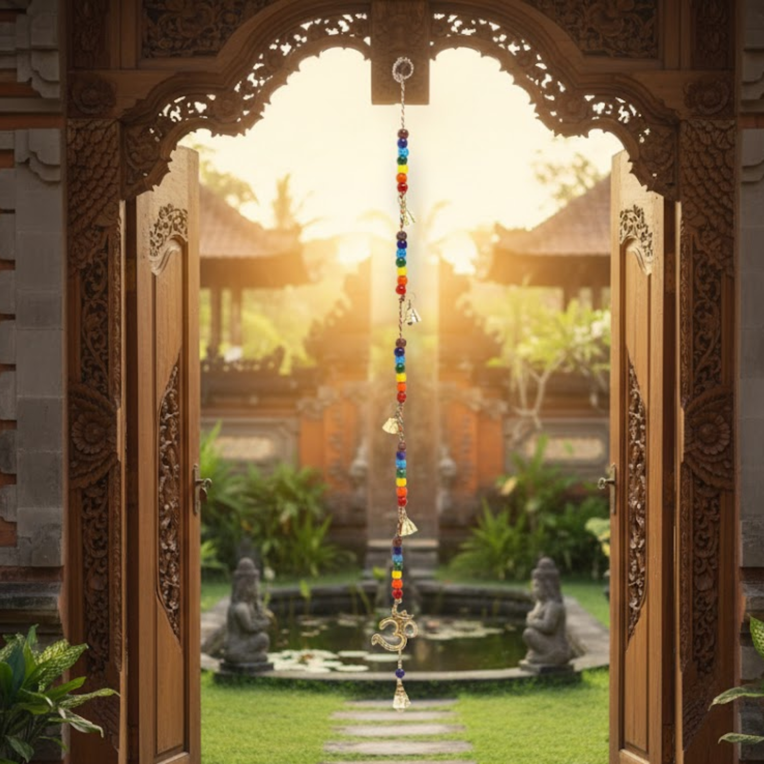 En myk bris løfter messingbjellene i bevegelse, og slipper ut lyse, milde toner som henger igjen i luften. En slank tråd med regnbuefargede perler fanger lyset, og leder blikket til Om (ॐ) i hjertet — en stille påminnelse om balanse, nærvær og den usynlige bevegelsen av energi. 🌬️🕉️
