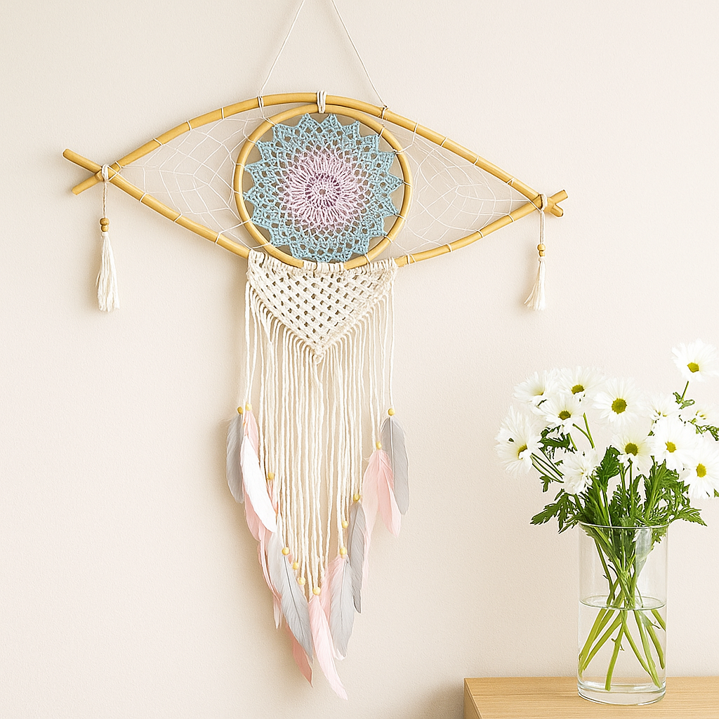 Drømmefangere stammer fra Ojibwe-folket og deles blant mange urfolksamfunn; i den tradisjonelle historien passerer gode drømmer gjennom den åpne sirkelen mens uønskede drømmer hviler i nettet og forsvinner med morgenlyset. Øyemotivet—vidt kjent i middelhavs-, Midtøsten- og andre kulturer—beholdes som et tegn på beskyttelse og omsorg. Sammen gir de en mild påminnelse om å sove med tillit og våkne med klarhet. 🌙
