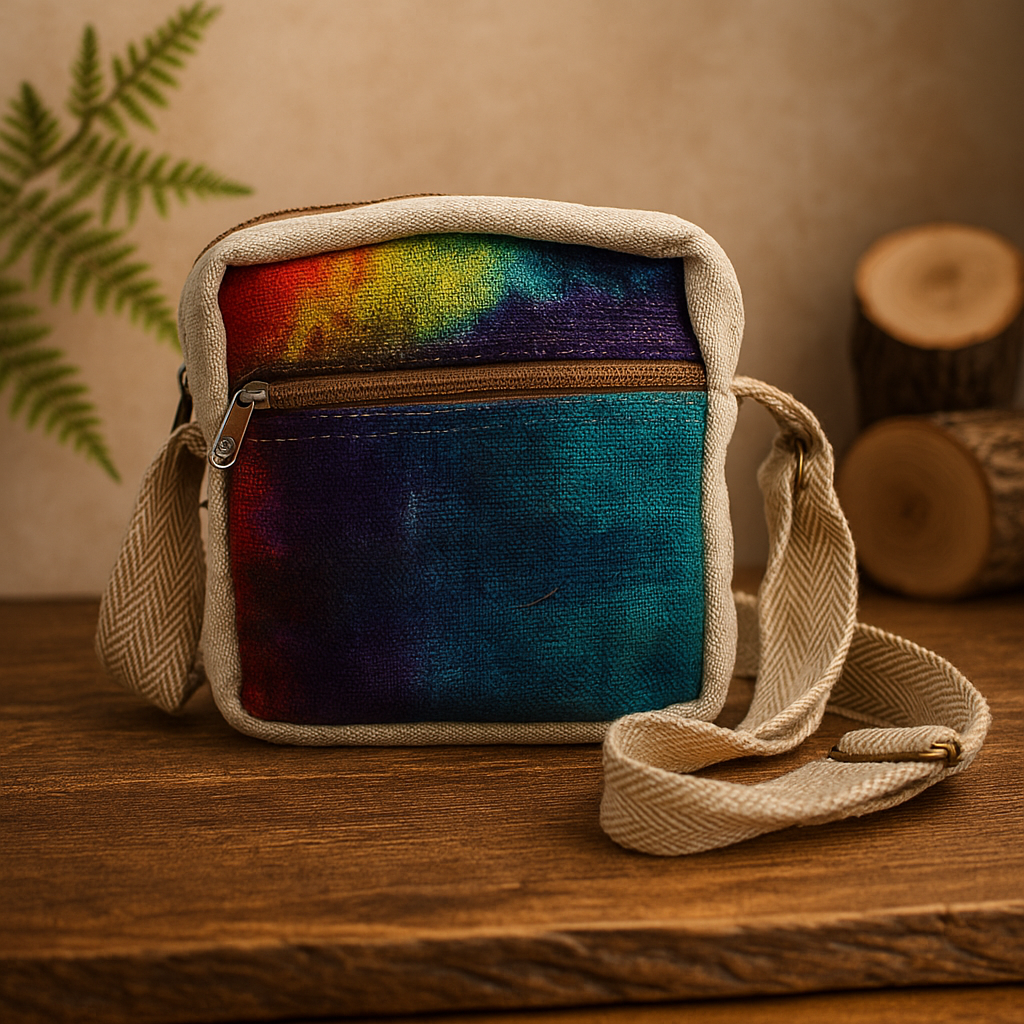 Vevd av solid hamp–bomull, har stoffet en naturlig, teksturert følelse. Beige kanter rammer inn et flerfarget gradient frontpanel—rødt til lilla—med en subtil vevd dybde. Omtrent 21 × 20 cm. Den brede fiskebensstroppen kan justeres for skulder- eller crossbody-bruk; en toppglidelås sikrer hovedrommet, og en frontglidelåslomme holder småting nær. Sølvfarget metallbeslag, synlige sømmer og innbundne kanter vitner om nøye håndverk fra Nepal. 🌈