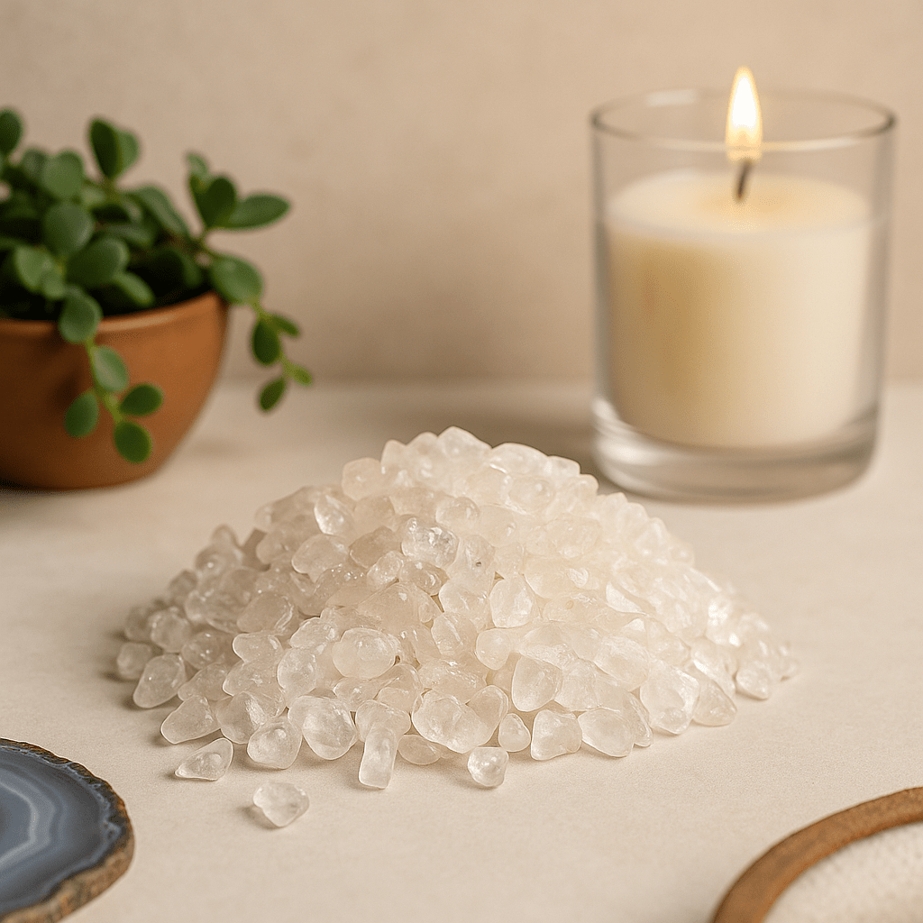 Kjølige å ta på og mykt glinsende, samler disse små krystallflisene lys og tekstur i håndflaten. De er enkle, vakre naturbiter å strø, arrangere og skape med — en rolig følgesvenn for bevisste, kreative øyeblikk.