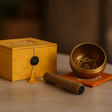Ensemblet inkluderer en metallskål med en varm messing–bronse finish, dens indre prydet med et sakralt chakra-motiv og subtile ringbånd, en glatt treklubbe, og en mykt polstret oransje pute. Skålen bærer en klar, resonant tone; klubben lar deg banke og deretter sirkle kanten for en vedvarende tone; puten stabiliserer skålen og forhindrer demping slik at lyden kan blomstre. En marmorert oransje minneboks med enkel snor- og knapp-lukking holder alt mellom øktene.