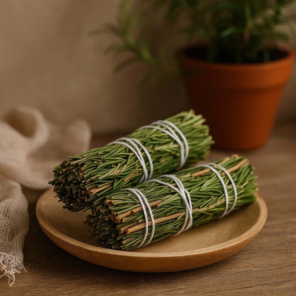 🌿 En håndbundet bunt av hellige urter: rosmarin bundet med hvit snor, med sine slanke, nåleformede blader samlet i en rustikk sylinder. Når den tennes, frigjør den en kjølig, grønn aroma—urteaktig, furukysset og mykt harpiksaktig.