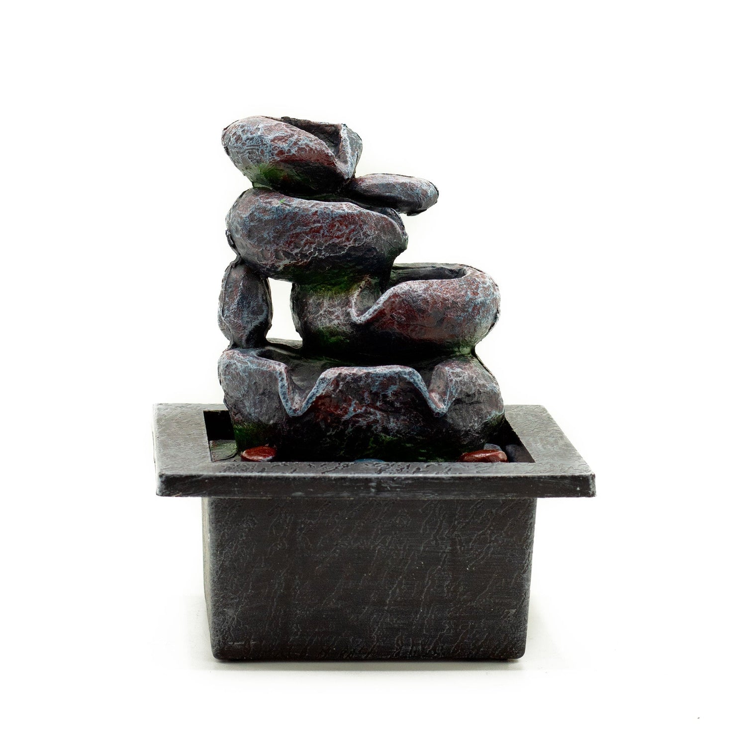 Dette fredelige midtpunktet bringer vannets stillhet til hjemmet eller arbeidsplassen din. En lagdelt, stein-inspirert form med grov, steinlignende tekstur og stablede, skålformede nivåer styrer flyten, mens glatte småstein ved basen tilfører et jordnært, naturlig preg. 💧