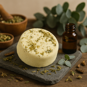 Holdt i håndflaten møter denne bleke, puck-formede brusen—prikket med tørket kamille—varmt vann og blomstrer til små, lekne bobler. En mild bølge av søt kamille og varm honning stiger; et lite øyeblikk for bare å nyte. 🌼✨
