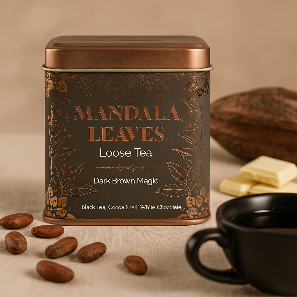 Wspaniała sama w sobie lub z odrobiną mleka. Parz 3–4 minuty w niemal wrzącej wodzie, aby uzyskać zaokrąglone czekoladowe nuty. Zapakowana w matową, ciemnoszarą puszkę z miedzianym nadrukiem mandali liści — cicha pamiątka, która doskonale pasuje do uważnego kącika herbacianego. Mandale, obecne w różnych kulturach, często symbolizują równowagę i całość; tutaj po prostu zapraszają do spokojnej chwili przed pierwszym łykiem.
