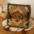Teksturowany kilim w ciepłym beżu, z centralnym stopniowanym diamentem i żywymi jodełkami, wykończony brązem z zabawnymi chwostami — wygodna torba na skos, która łączy codzienną użyteczność z łatwym stylem. 🧶