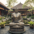 Siedząc po turecku, lewa ręka spoczywa spokojnie na kolanach (dhyana), podczas gdy prawa ręka jest uniesiona z otwartą dłonią — uspokajający gest rozpoznawany w tradycjach buddyjskich. Zamknięte oczy i delikatne, spokojne usta zapraszają do wyciszenia. Gęste, zaokrąglone loki zwieńczone kokiem, wydłużone płatki uszu i szata uformowana w głębokie, płynne fałdy oddają hołd klasycznym detalom. Zintegrowana, warstwowa podstawa przypomina kwitnący lotos, ugruntowując postać z gracją.