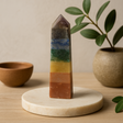 Chłodny, polerowany kamień spotyka cichą geometrię: smukły obelisk w siedmiu świetlistych pasach, wznoszący się od ziemistego czerwonobrązowego do miękkiego fioletowego czubka. Artystyczny, inspirowany czakrami element na chwile zatrzymania. 🌈