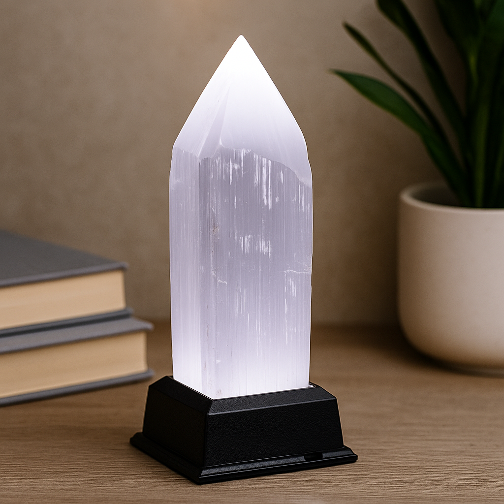 Chłodna w dotyku, z miękkim satynowym blaskiem, ta biała wieża z selenitu rozprasza światło wzdłuż swoich drobnych pionowych prążków — cichy, księżycowy połysk pochodzący z pustyń Maroka. Jej nazwa honoruje Selene, grecką boginię księżyca. 🌙