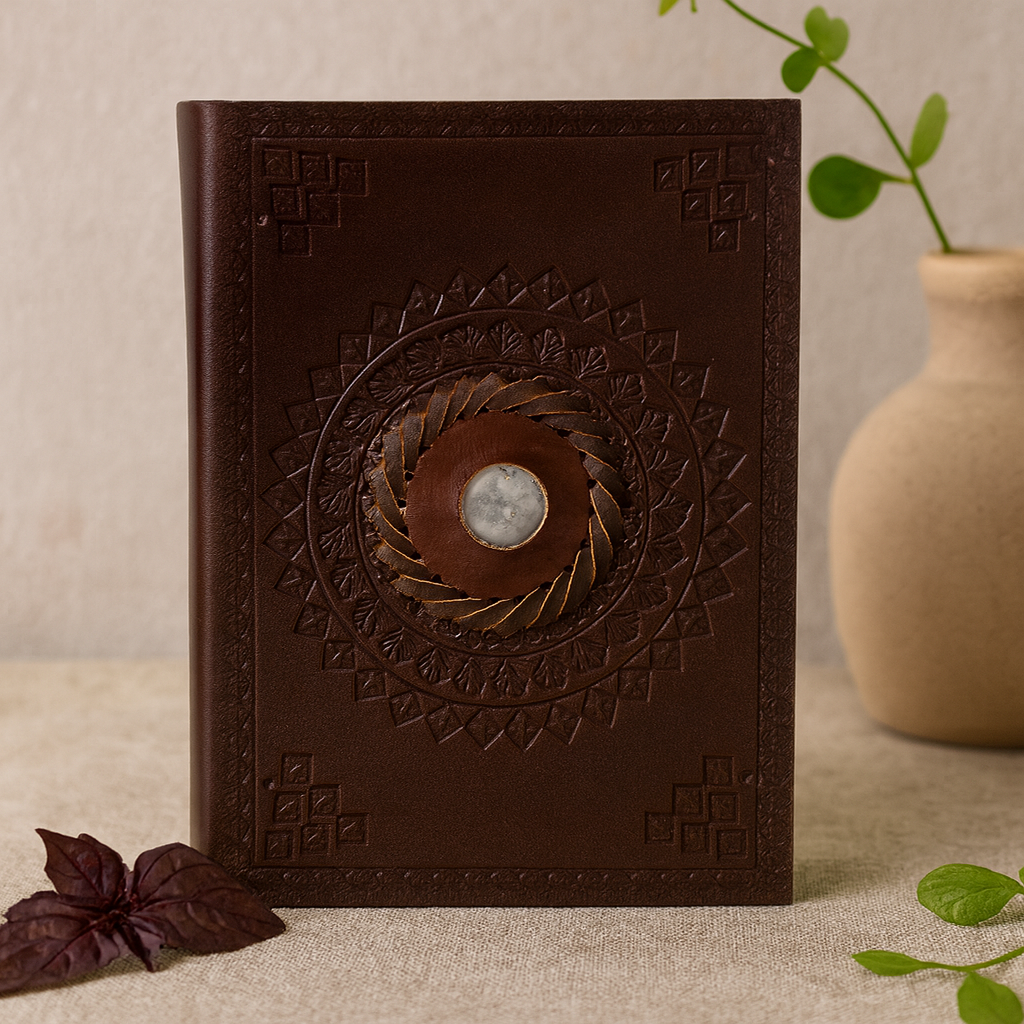 Teksturowana brązowa okładka miękko spoczywa w twoich dłoniach, a jej koncentryczne tłoczenia przyciągają wzrok ku gładkiemu, jasnemu kaboszonowi w centrum. Wewnątrz otwiera się cicha przestrzeń — miejsce, gdzie myśli, emocje i intencje mogą się zebrać i przybrać formę. Osobista świątynia w pisemnej formie, gotowa zawsze, gdy ty jesteś. 🌙