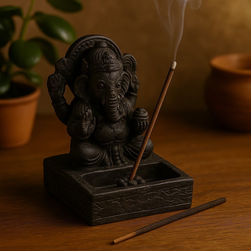 Figura jest bogato zdobiona: ozdobny hełm, duże uszy, żebrowany trąbka i rzeźbiona biżuteria, otoczone okrągłą arkadą za głową. Powierzchnia ma postarzały, teksturowany wygląd w głębokiej szarości do czerni, a prostokątna podstawa jest niska i stabilna. Z przodu taca z małym podniesionym stołkiem w kształcie stożka starannie zbiera popiół; obramowanie z motywem winorośli dodaje delikatnego akcentu. W wielu tradycjach Ganesha symbolizuje mądrość, naukę i usuwanie przeszkód — często trzymany blisko drzwi, biurek lub przestrzeni do medytacji jako przemyślane przypomnienie. 🕯️