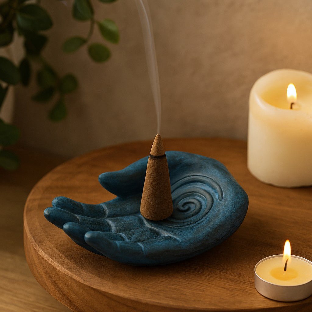 Ukształtowany jak miseczka, dłoń zwrócona do góry, emanuje spokojem na stole. Matowe niebieskie wykończenie ma delikatnie cętkowany, postarzały wygląd; powierzchnia jest subtelnie teksturowana w dotyku. Gładkie, zaokrąglone krawędzie płynnie otaczają delikatnie wygięte palce, z podniesioną spiralą umieszczoną na środku dłoni. Spirala to motyw widoczny w wielu tradycjach, często kojarzony z rozwojem i ciągłością, podczas gdy otwarta dłoń jest uniwersalnym znakiem powitania i ofiarowania. Umieszczony w dłoni stożek kadzidła pali się czysto, a popiół gromadzi się schludnie wokół niego. 🌀