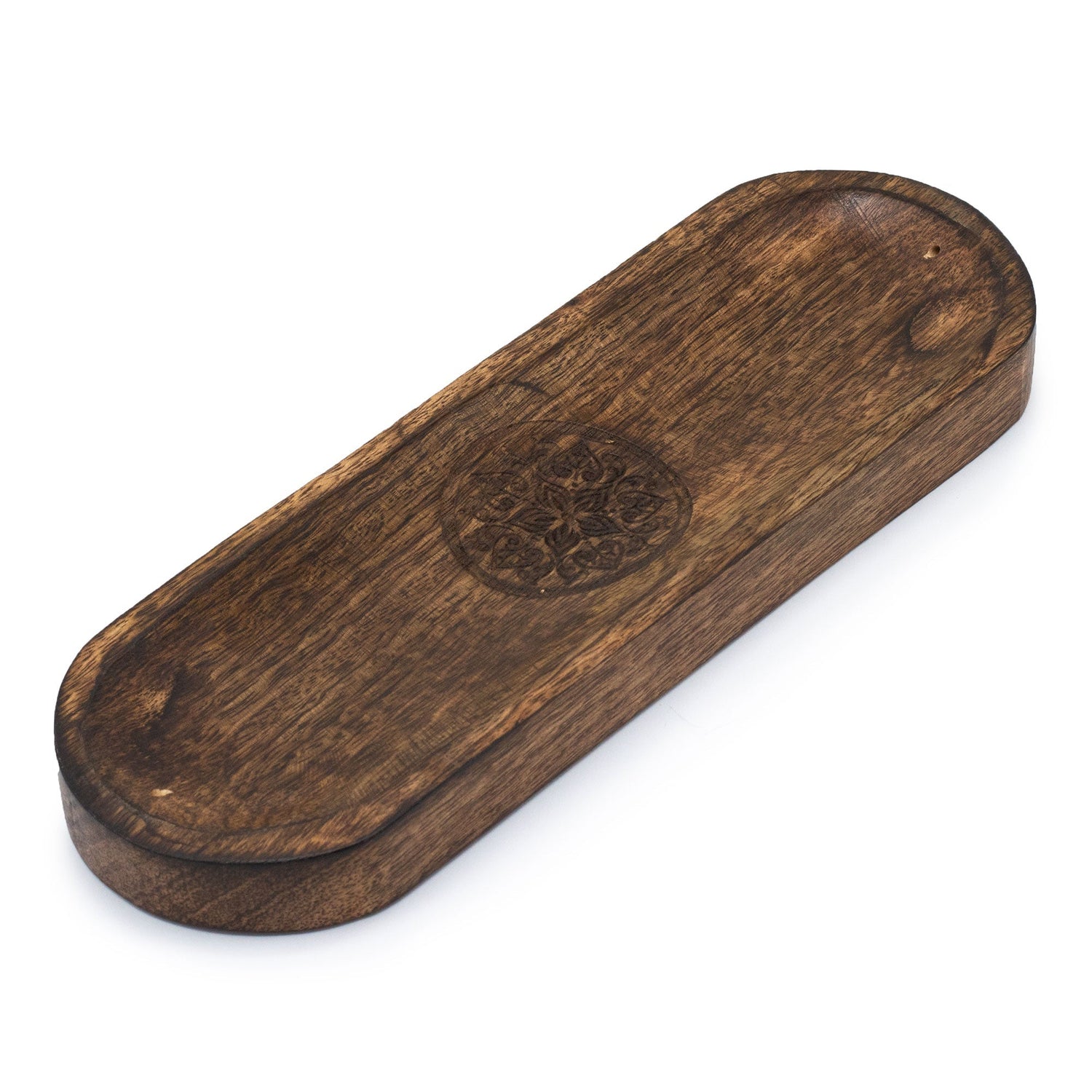 W kształcie eleganckiej kapsułki (ok. 30 × 10 cm), taca ma delikatnie podniesione krawędzie, które zatrzymują popiół, oraz naturalne usłojenie widoczne przez głęboki brązowy bejcę. Na środku precyzyjnie wygrawerowano pojedynczą mandalę; w wielu tradycjach mandala symbolizuje równowagę, całość i spokojny umysł. Mały nawiercony otwór zabezpiecza kadzidło w patyczku, a płytka okrągła miseczka mieści stożek — oba utrzymane w porządku w zakrzywieniu tacy. 🪵