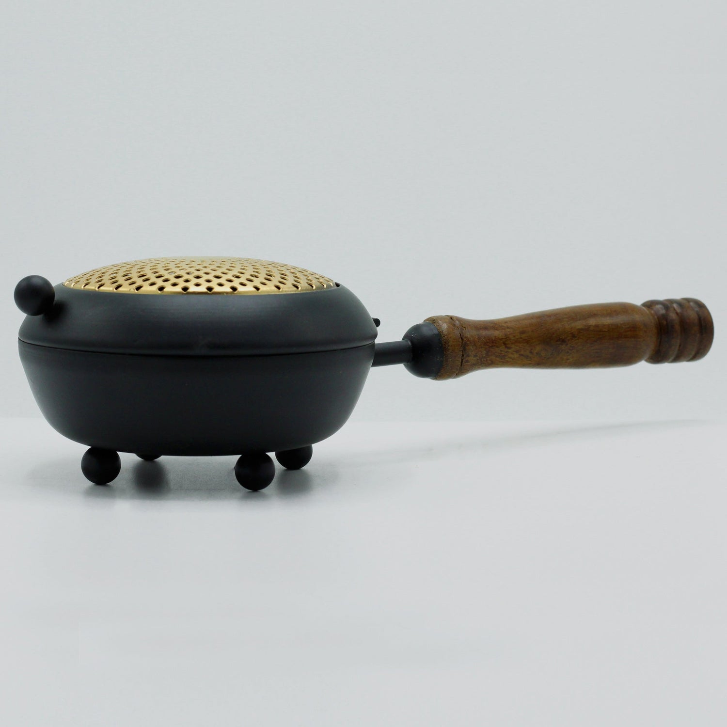 Zaokrąglone, garnkowe ciało z matowego czarnego żelaza połączone jest z ciepłą, mosiężną, perforowaną pokrywką, która równomiernie uwalnia dym, jednocześnie zatrzymując popiół. Obracany drewniany boczny uchwyt dodaje chłodnego, naturalnego akcentu, osadzony na czarnej tulei dla wytrzymałości. Trzy małe kuliste nóżki unoszą podstawę dla stabilności i przepływu powietrza, a starannie umieszczony przeciwny bolec równoważy formę. Gładkie linie, dwukolorowe wykończenie i pojemna miseczka czynią ją praktyczną i cicho elegancką dla stożków, węgla i żywic. ✨