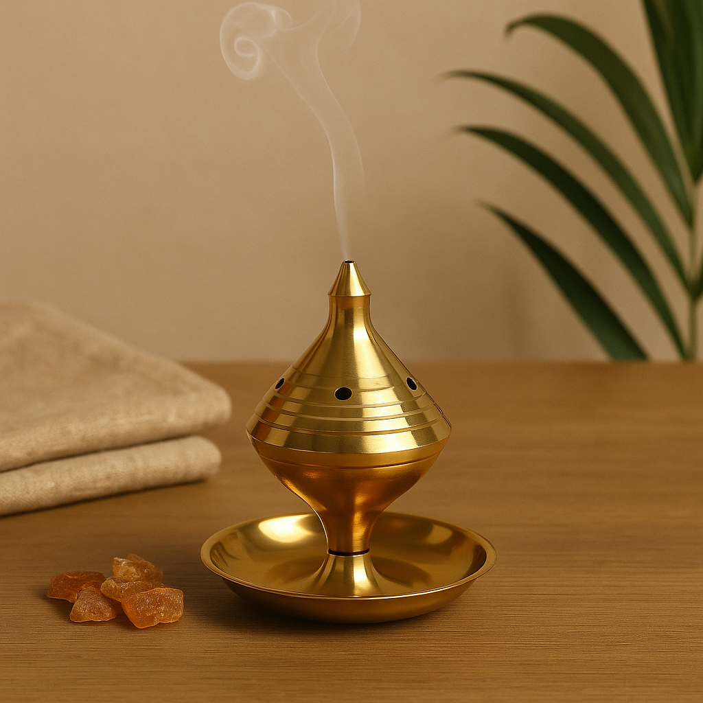 Delikatny blask polerowanego mosiądzu i miękka wstęga zapachu tworzą cichą chwilę troski. Wykonany w Indiach, gdzie kadzidło jest częścią codziennego życia w domach i świątyniach, ten kompaktowy podgrzewacz niesie długą tradycję uważnego rytuału do Twojej przestrzeni. 🌿