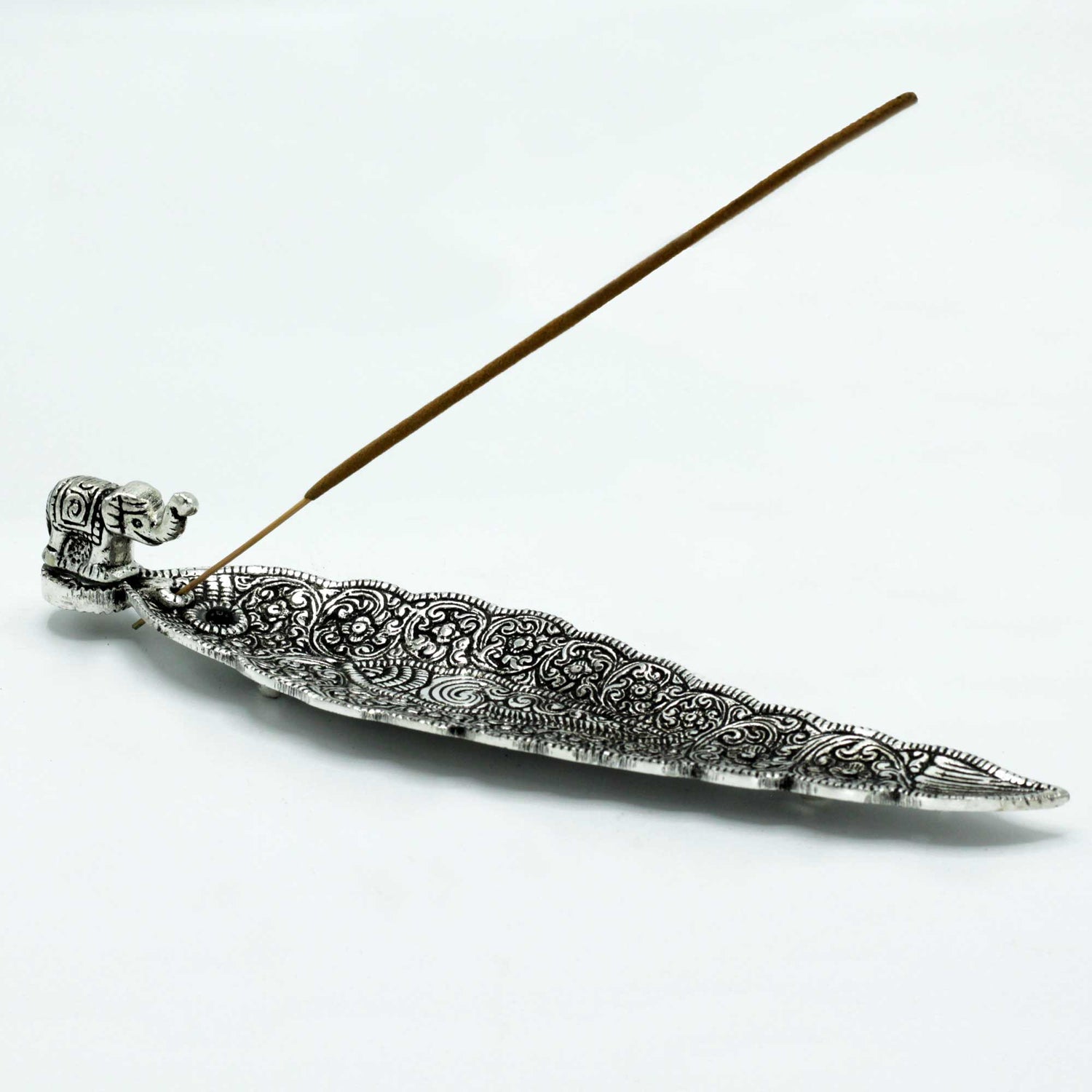 Wykonana z polerowanego, srebrzystego aluminium, taca o długości 20 cm jest gładka w dotyku, z delikatnie postarzałymi zagłębieniami, które pogłębiają jej ozdobny relief. Wzniesione ornamenty i liściaste wzory płyną w symetrycznych segmentach, obramowane drobnym koralikowym brzegiem i zwężające się do teksturowanego zakończenia — eleganckie detale, które łapią światło i cień. Mała figurka słonia na początku stabilizuje wzór i trzyma standardowe kadzidełka w sztyfcie, podczas gdy wydłużony kanał zbiera popiół dla prostego, schludnego użytkowania. W wielu indyjskich tradycjach słoń kojarzony jest z mądrością, stabilnością i szczęściem — często witany w domu jako szacowny symbol ochrony i troski. 🌿