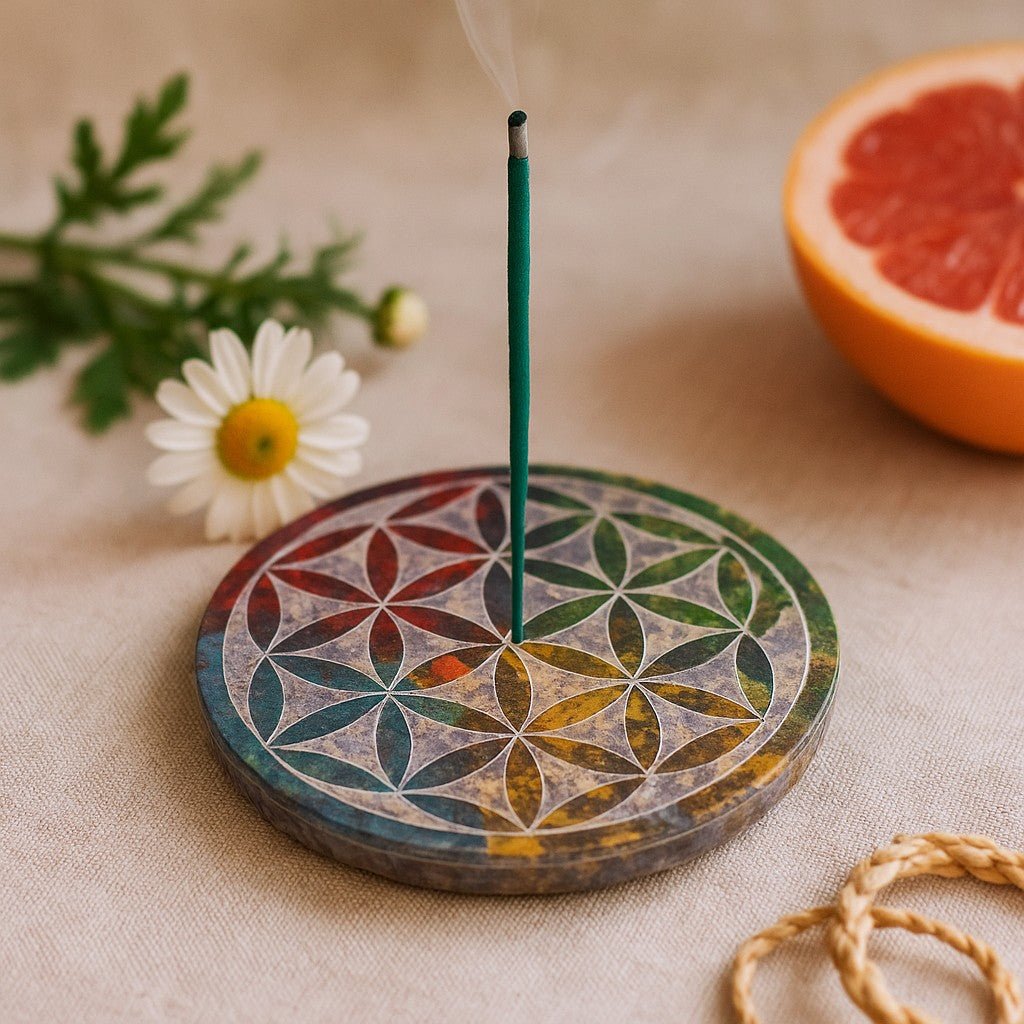 Okrągły, płaski profil ma lekko błyszczące wykończenie i subtelnie ścięte krawędzie, które są miękkie w dotyku. Na górze, zazębiające się koła tworzą Kwiat Życia — ponadczasowy geometryczny motyw — osadzony w marmurkowej grze czerwieni, niebieskiego, zieleni, żółci i fioletu, otoczony ciemną ramką. Wzór jest zarówno żywy, jak i spokojny, a szeroka powierzchnia starannie zbiera opadający popiół, ułatwiając sprzątanie. Kwiat Życia jest powszechnie kojarzony z harmonią, równowagą i współzależnością, często trzymany w pobliżu jako kontemplacyjna przypominajka w domu. ✨