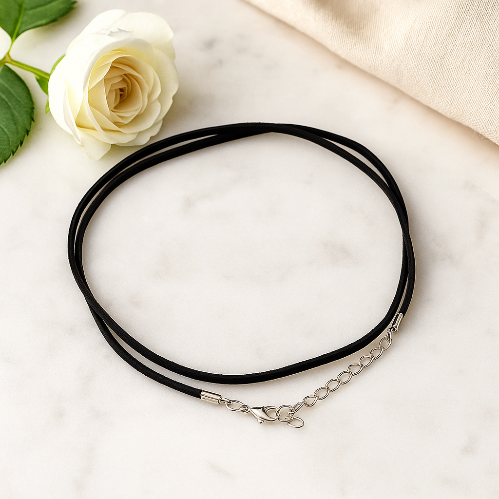 Miękki, matowy czarny sznurek jest gładki i lekki na skórze, z wąskim, okrągłym profilem, który utrzymuje czysty wygląd, podczas gdy srebrne elementy metalowe delikatnie błyszczą. 🖤✨