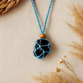 Nieregularne polerowanie zawieszki łapie światło subtelnym blaskiem, podczas gdy jasnoniebieska siatka widocznych węzłów otacza ją z łatwością. Chłodny sznurek podkreśla głębię kamienia; średniobrązowa koralika równoważy paletę. Regulowana długość pozwala nosić ją na obojczyku lub dłużej dla swobodnego wyglądu. Wiązanie makramowe jest praktykowane w różnych kulturach jako sztuka cierpliwości i więzi — tutaj nadaje delikatną fakturę i ugruntowane uczucie na co dzień. 🧵
