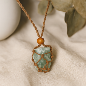Nieregularna forma zawieszki jest otulona misternym makramowym oplotem, z równomiernie rozmieszczonymi węzłami tworzącymi bezpieczną, przewiewną siatkę. Skręcony brązowy sznurek z włókna i mała drewniana koralika dodają ziemskiej harmonii, pozwalając kamieniowi grać główną rolę, jednocześnie utrzymując wszystko stabilnie do codziennego noszenia. Wiązanie makramowe — starożytna sztuka obecna w wielu kulturach — wnosi do tego elementu zarówno strukturę, jak i subtelną fakturę. 🧵