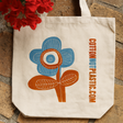 Tkana z wytrzymałą, przypominającą płótno fakturą, naturalna, kremowa tkanina daje poczucie bezpieczeństwa w dłoni. Na froncie znajduje się wyrazisty, sitodrukowy kwiat — niebieskie płatki z pomarańczowym środkiem, łodygą i liśćmi — prosty motyw, który rozjaśnia dzień. Wykonana z troską w Indiach, łączy codzienną trwałość z delikatnym urokiem.