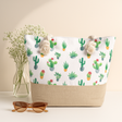 Solidne, materiałowe ciało łączy się z widocznie tkanym dolnym panelem w miękkim beżu, zwieńczonym czystą, białą górą. Kaktusy i sukulenty przypominające akwarele w małych brązowych doniczkach dodają delikatnego zielonego rytmu, z okazjonalnym czerwonym kwiatem. Grube, miękkie uchwyty z liny — starannie zawiązane — wygodnie leżą, niezależnie czy noszone na ramieniu, czy trzymane przy boku. Szeroki, miękki kształt ma płaską podstawę, która lekko się opiera i łatwo się pakuje, gdy nie jest używany.
