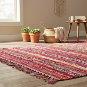 The weave feels sturdy beneath the hand, the surface alive with warm reds and pinks, flecked with brighter threads. A handcrafted rag rug, it carries the quiet wisdom of making do with care — a piece shaped by resourcefulness and tradition. In many parts of India, chindi rugs have long transformed leftover textiles into something lasting and beautiful. 🌿