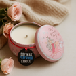 A small, steady flame rises through creamy soy wax, and the room softens. Parma Violet drifts in first — delicate and powdery — cradled in a round, low-profile tin with soft pastel florals and a gentle invitation on the lid: “enjoy the journey.”